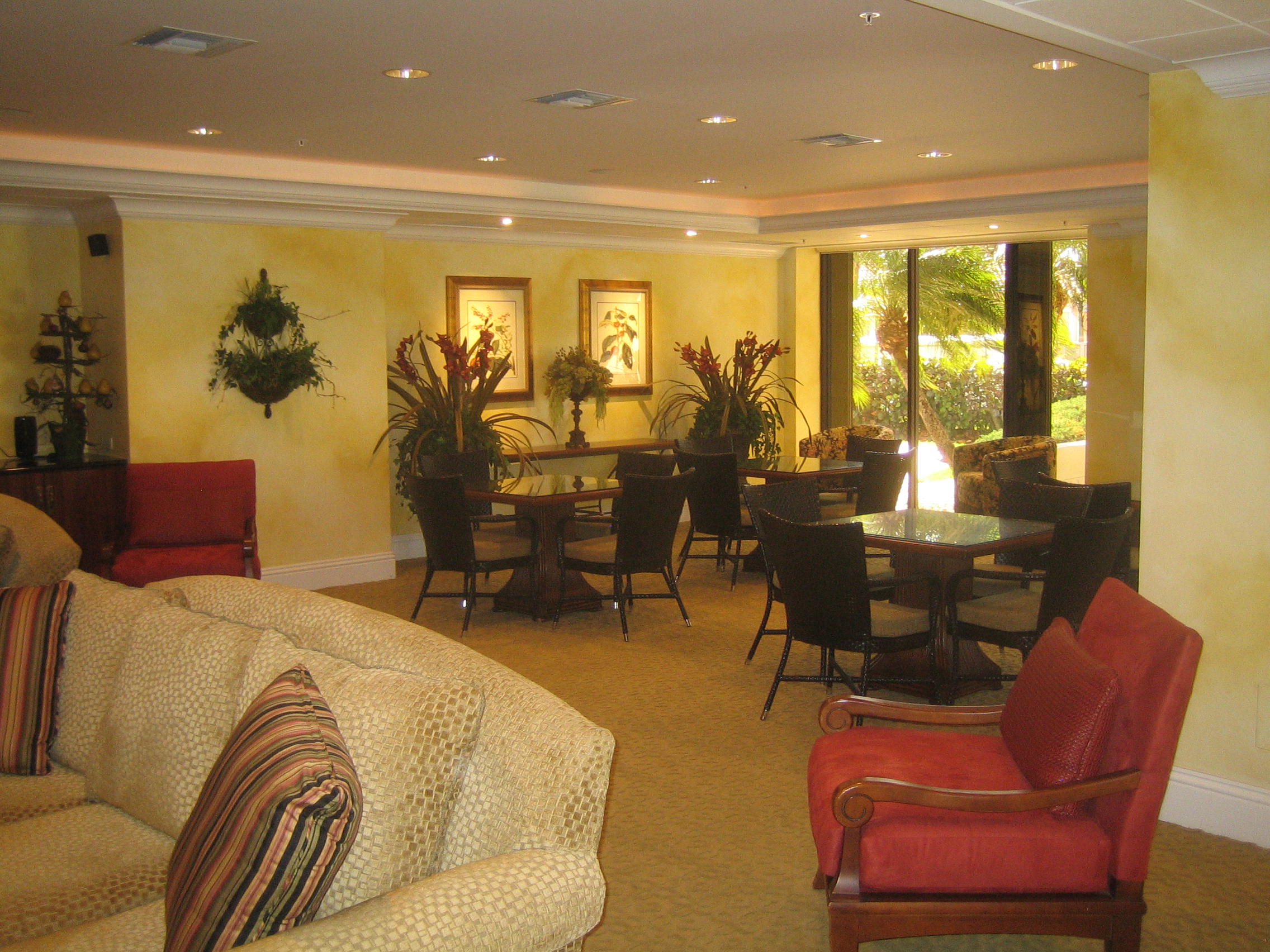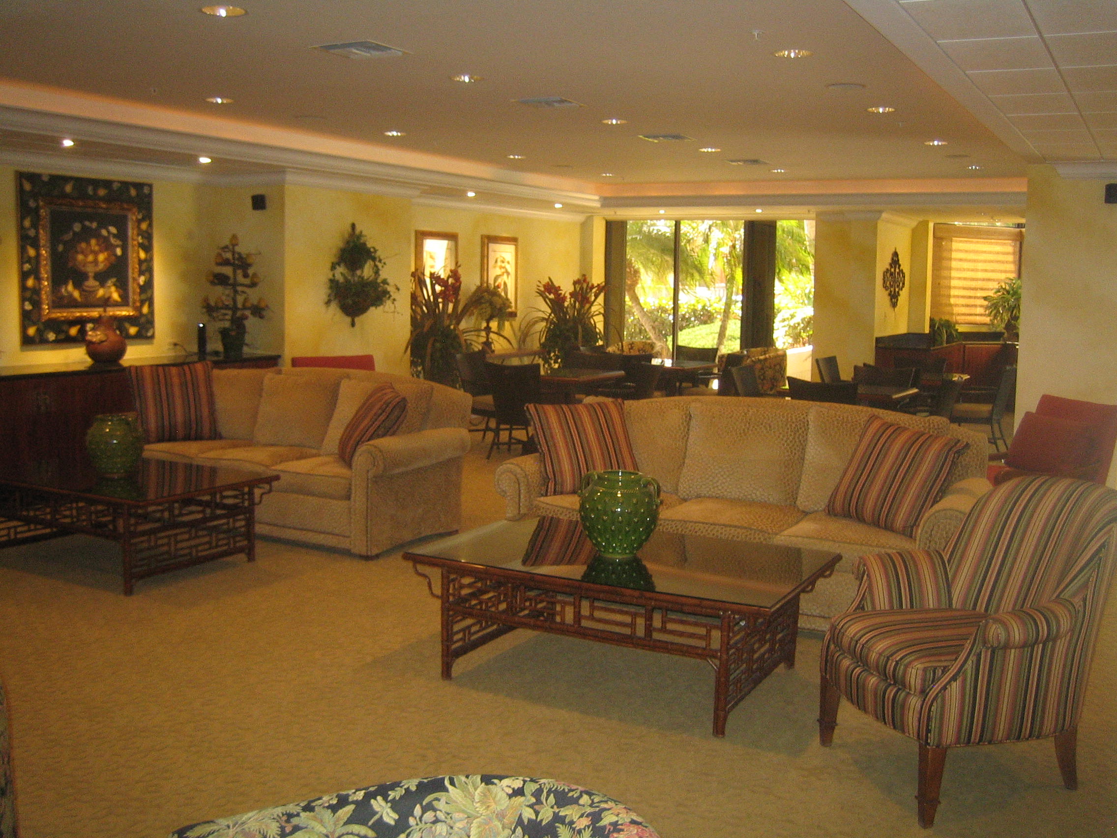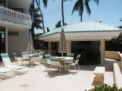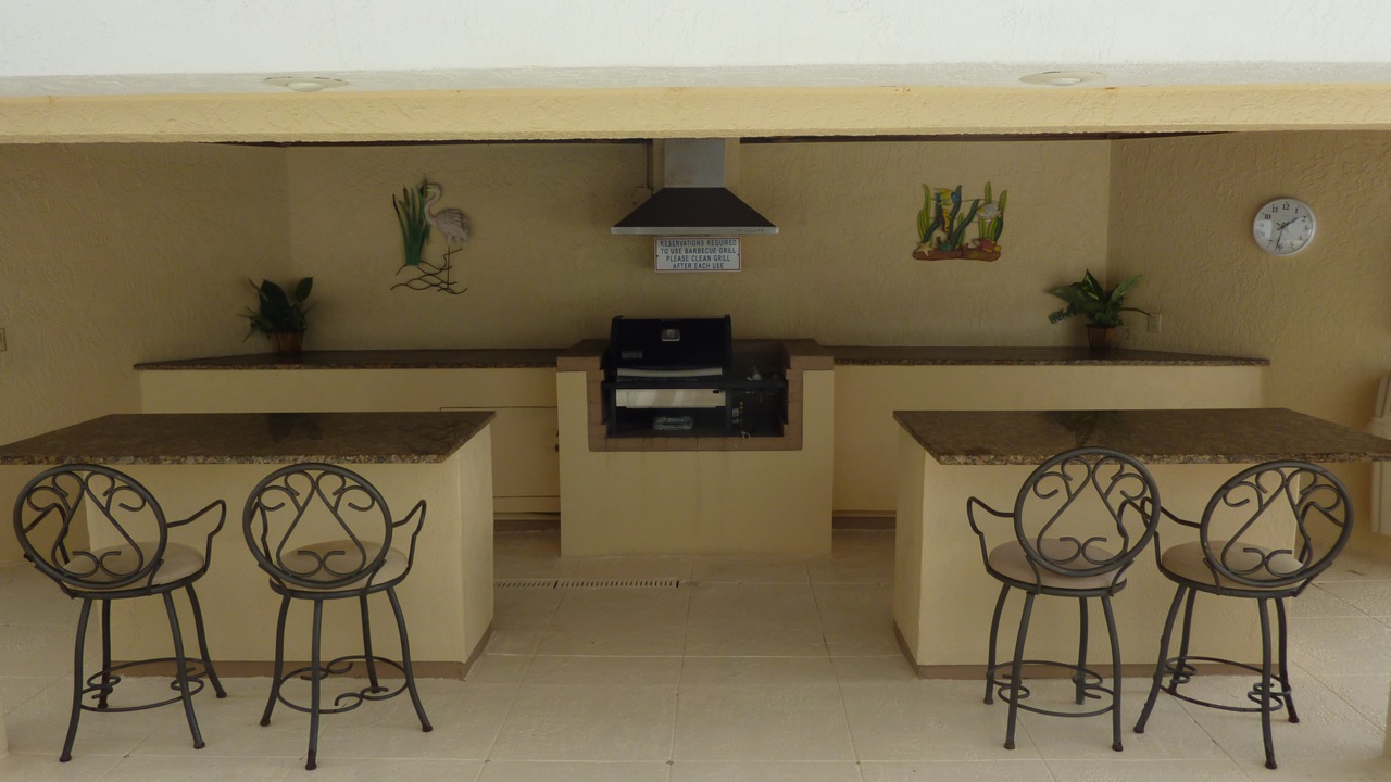 We have a beautifully decorated social room. Complete with HDTV, comfortable seating, dining area with wet bar and a complete kitchen. It leads to an outdoor eating area with grill. The outdoor area is adjacent to the pool area. Click on the photo to see a larger view.