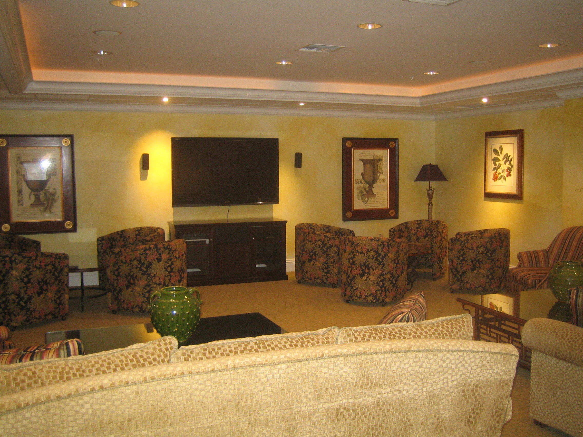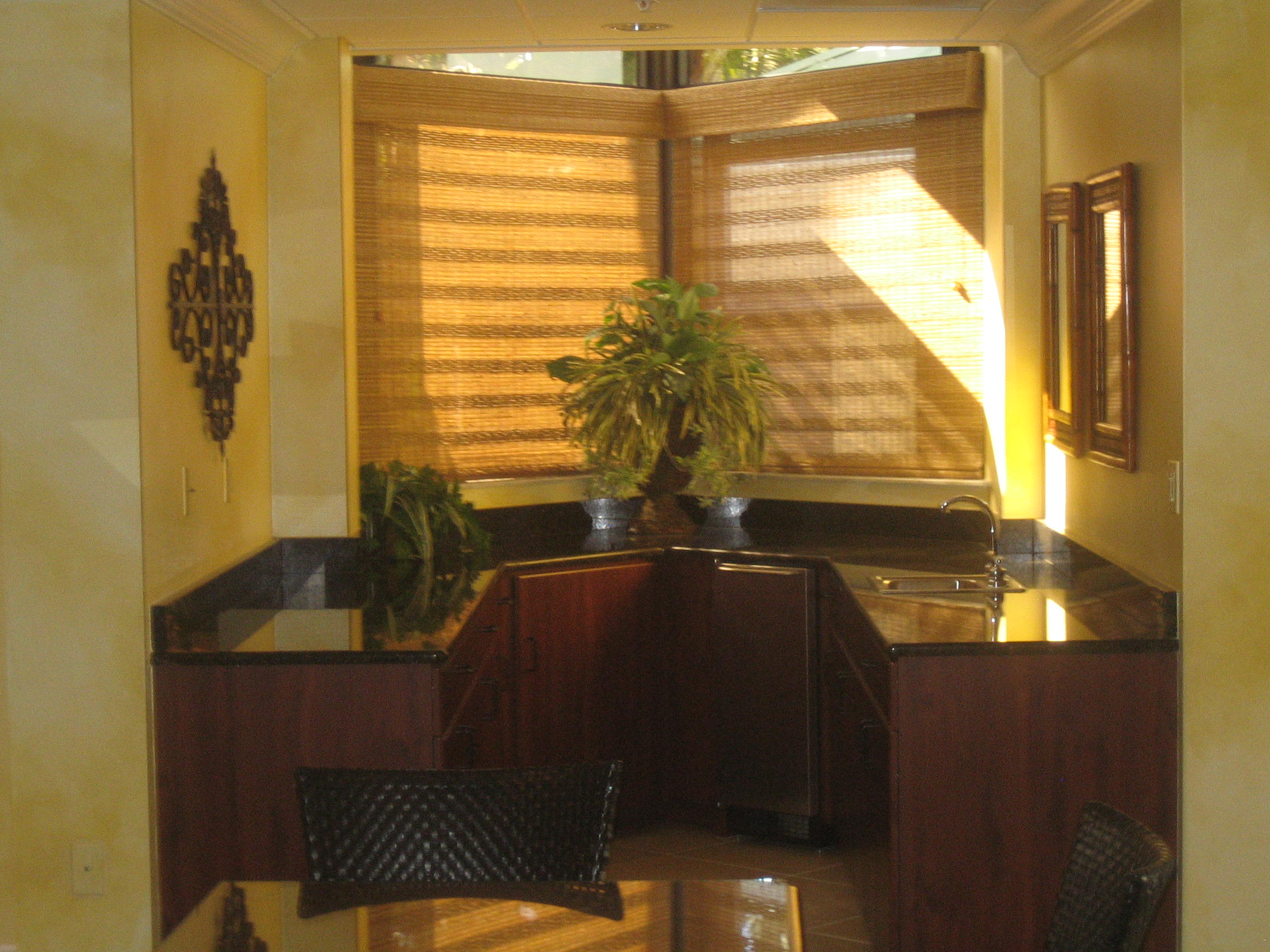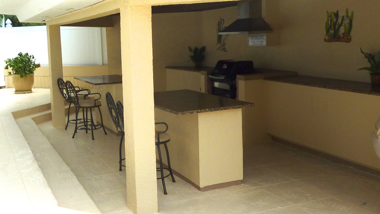 We have a beautifully decorated social room. Complete with HDTV, comfortable seating, dining area with wet bar and a complete kitchen. It leads to an outdoor eating area with grill. The outdoor area is adjacent to the pool area. Click on the photo to see a larger view.